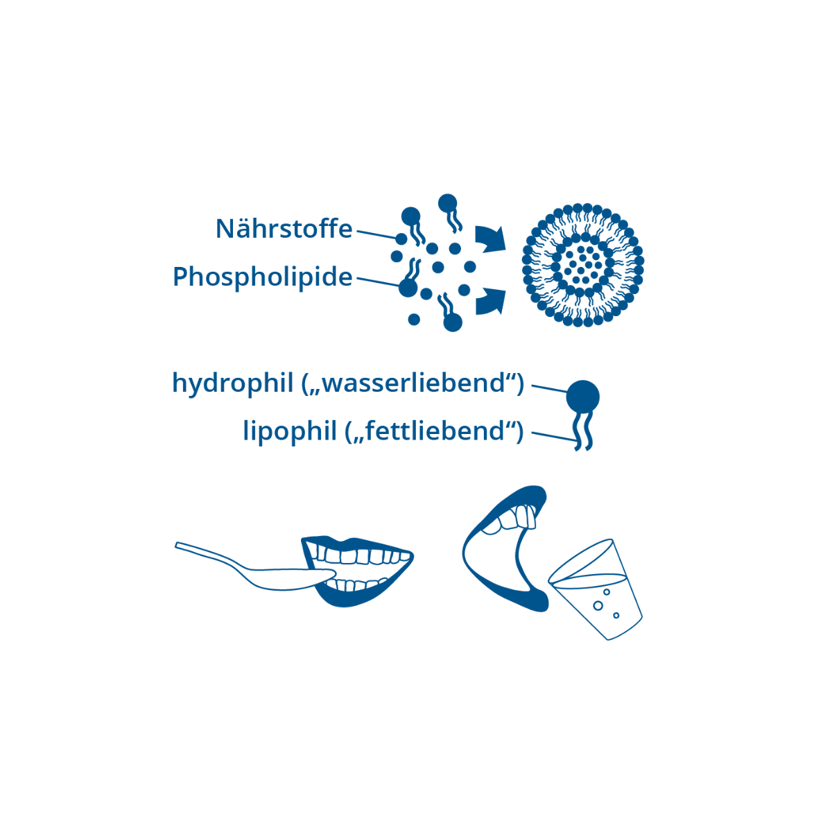Phospholipide sind polare Lipide, die aus einem hydrophilen („wasserliebenden“) Kopf und zwei lipophilen („fettliebenden“) Fettsäureketten bestehen, die über ein Glycerinrückgrat miteinander verknüpft sind. In einer wässrigen Umgebung bilden sie charakteristische Doppelschichten, (sog. Liposomen) indem sich die fettliebenden Enden zueinander hin orientieren und die polaren, wasserfreundlichen Kopfgruppen nach außen und innen zur Wasserphase hin ausrichten. Mit einem mehrstufigen Verfahren stellen wir ultrakleine Liposomen her, die in ihrem Inneren Nährstoffe enthalten.